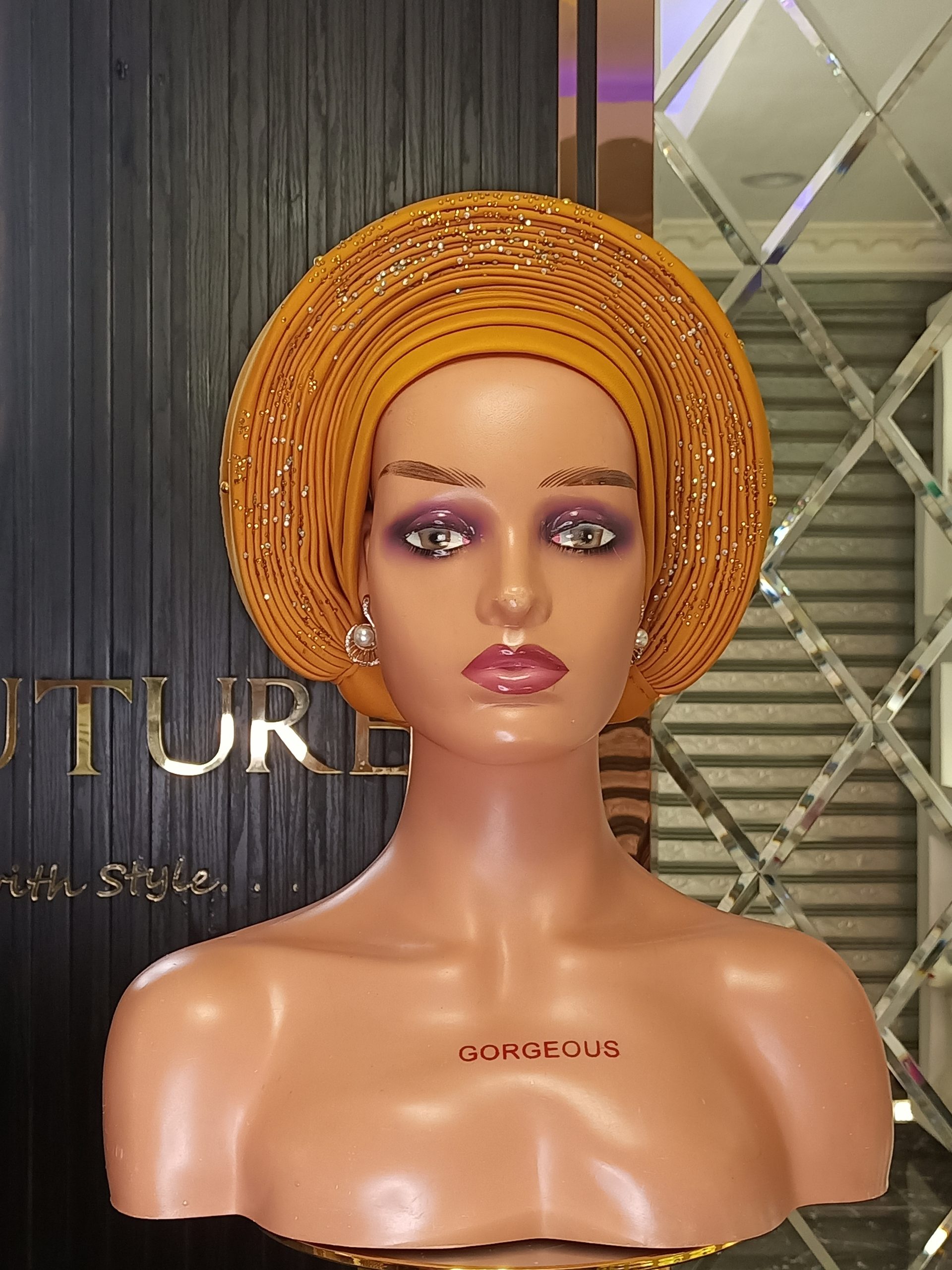 This is a ready-to-wear AUTO GELE designed for effortless style and comfort. This chic accessory is made from scuba material having an adjustable straps and ropes at the back, allowing you to customize the fit for maximum security and support. Embellished with rhinestones ,Embrace elegance with this versatile turban, making it an essential addition to your wardrobe.